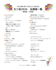 出演者の名前をクリックすると、各出演者の紹介ページが表示されます。 ArtistaKAZU Rika Ando えいじ オーバートーン オマールえび 加藤みきお&加藤ひろみち くす田くす博 Kei 健山 後藤 凌(Ryo) komatan サクノキ サゴー サンキュー手塚 東雲ゴールド じゃぐたく ジャグリングドラゴンヒョウガ SHANTI&MARINO ジョー次 すごろく ダンディふくちゃん to R mansion NARU ハットマンPepE パフォーマーASUKA パフォーマンストリオCZ↑ ブンブク 豊来家幸輝 Box performerまさきち MAGICIAN HIROSHI Mal 三雲いおり ものまる Yo-Yo Entertainer TOMMY 吉川健斗 りずむらいす リューセー Rei Iwakura アートパフォーマー☆ファイター☆ マドンナーロ中村友美 アストロノーツ エディーエディー 魔石像WIZARD ミディアム・S・クラーク おもちゃのあひるパト てりやき エル